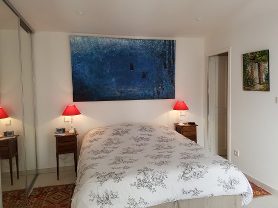 au dessus du lit :sans titre, 2015, huile sur toile travail à l'éponge, 195 x 130 cm.A droite: sans titre, 2012, acrylique sur toile, 89 x 162 cm.